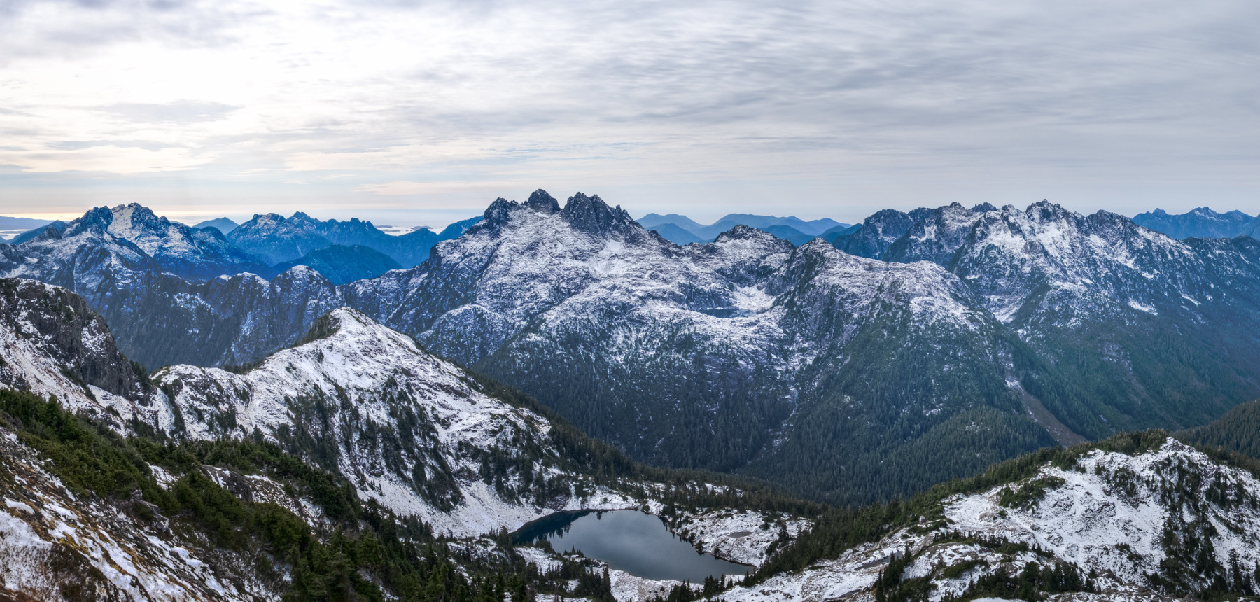Triple Peak just left of centre. Cobalt Lake sits below Hišimy̓awiƛ, the Alpine Club of Canada - Vancouver Island Section's bookable mountain hut.